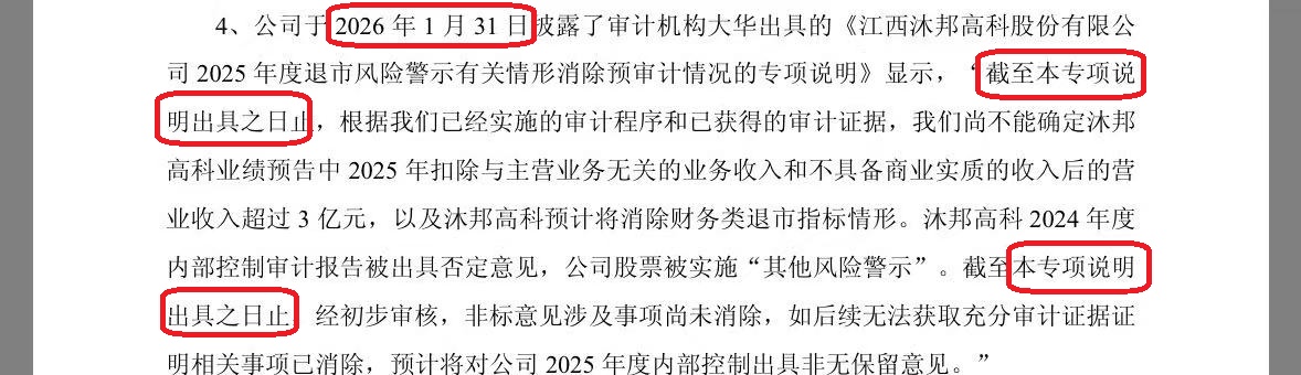 $*ST沐邦(SH603398)$恭喜在车上的兄弟们。 “截至本专项说明出具之日止,经初步审核,非标意见涉及事项尚未消除,如后续无法获取充分审计证据证明相关事项已消除,预计将对公司2025年度内部控制出具非无保留意见。”看来事务所将给出股票必须涨到88元的审计意见,恭喜兄弟们财富自由了。 哦,对了,募集资金违规占用的6个多亿还没还,这些钱必须真金白银的还到募集资金专用账户的。兄弟们,赶紧给你们口中...