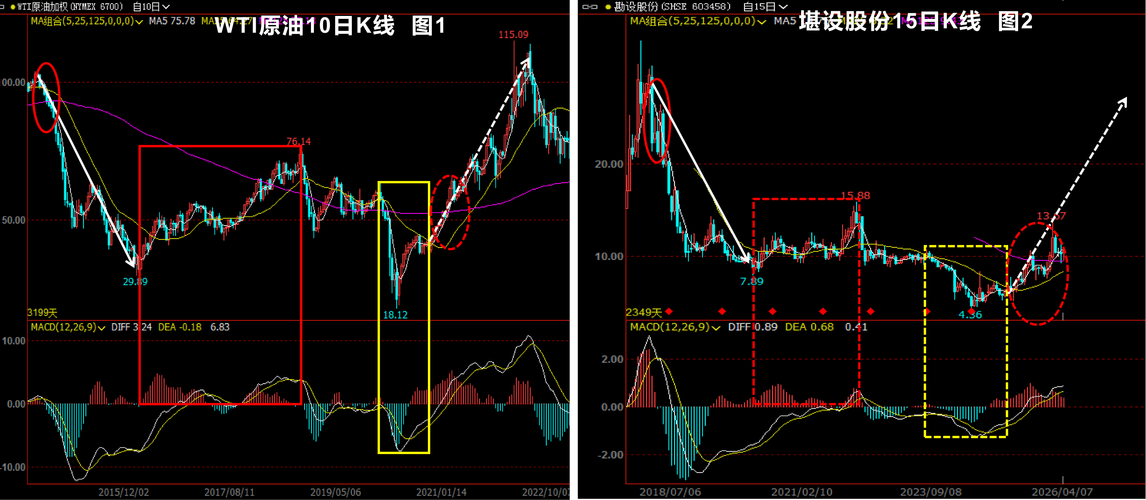 宏观层面的走势结构,原油的走势是可以和堪设的走势进行一番关公战秦琼的。目前堪设正在同构白色箭头所标注的上涨结构呢。图2中,两个红色圈圈内的走势结构是同胚同构的,只不过方向相反,而且图2中,两个白色箭头也是同胚同构且方向相反。