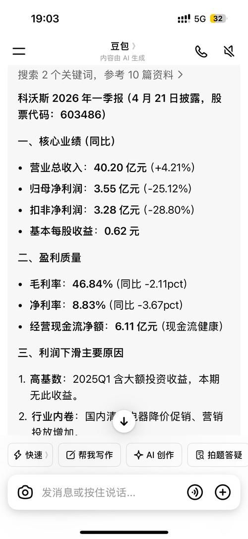 $科沃斯(SH603486)$很多人在用豆包问业绩,真的是令人发笑……豆包不是没有用,可以拿来验证逻辑啥的。但是,豆包本身就是一个爬取数据的工具,主力散播一些“消息”,多抓取几次,没有分析能力的韭菜再“验证”,就成真的了。假如这个图说的业绩是真的……扣非下滑28.8%,按照这个“答案”的结果反推,去年一季度扣非是4.22亿元,但是25年一季度明明是3.558亿元的扣非…… 有没可能,扣非确实就3....