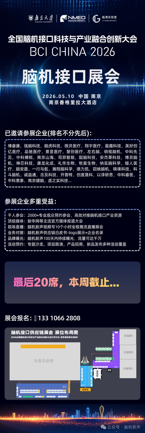 $荣泰健康(SH603579)$ 展商邀请函|2026全国脑机接口科技与产业融合创新大会及配套脑机接口供应链展会 搞脑机供应链的搞脑机供应链的脑机新声2026年4月14日11:04江苏听全文在小说阅读器读本章去阅读在小说阅读器中沉浸阅读当前,我国脑机接口产业正处于从技术突破走向产业落地的关键阶段。为进一步凝聚行业共识、构建协同生态,2026全国脑机接口科技与产业融合创新大会(以下简称“大会”)将于...