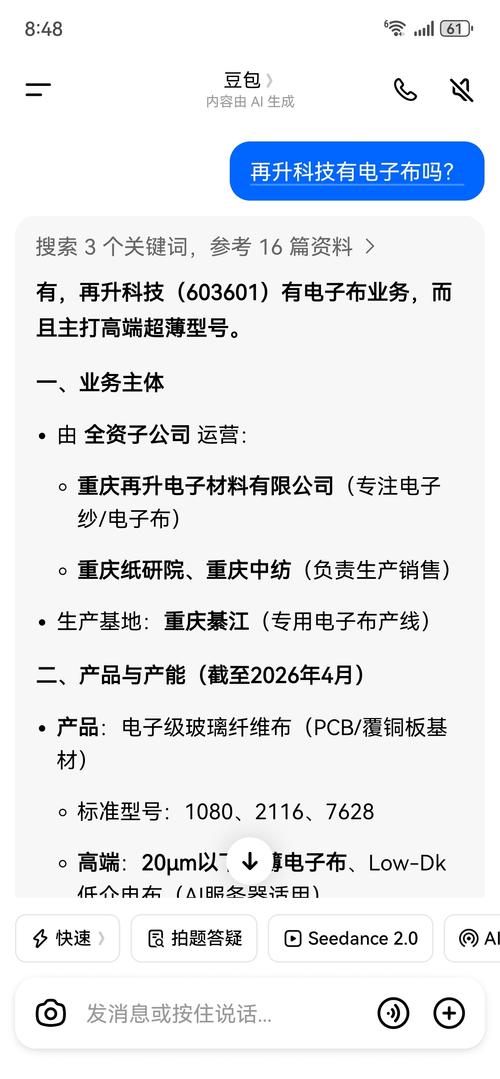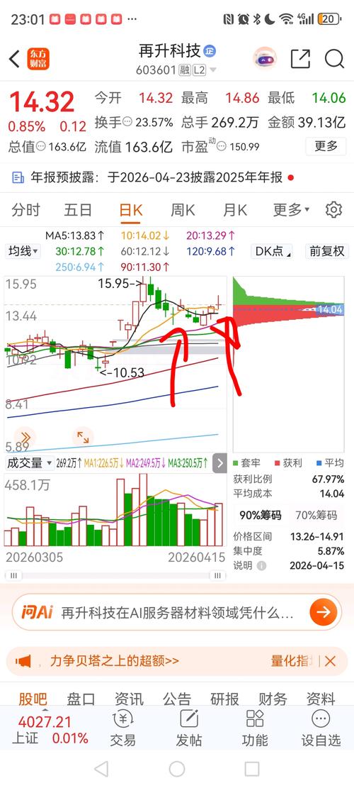 盘面观察与个股记录 $再升科技(SH603601)$ 从盘面上看:涨0.85%,成交额39.13亿,换手率23.57%,一只百亿市值的票,四分之一筹码今天换了一遍,这根带上影线的小阳线,配合天量换手,典型的高位分歧信号 基本面与消息面:核心逻辑超细玻纤+无尘洁净+储能过滤,AI数据中心/半导体厂房刚需,属于算力基建上游。4月23日要披露年报和一季报,4月22日开股东大会。最近公司一直在买理财,浦发...