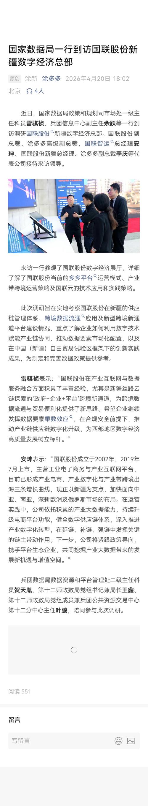 近日,国家数据局政策和规划司市场处一级主任科员雷骐祯、兵团信息中心副主任余跃等一行到访调研国联股份新疆数字经济总部。国联股份副总裁、涂多多高级副总裁、国联智运总经理安珅、国联股份新疆总经理、涂多多副总裁李庆等代表公司接待来访领导。 来访一行参观了国联股份数字经济展厅,详细了解了国联股份当前的多多平台运营模式、产业带跨境运营策略及国联云的技术应用和实践策略。 此次调研旨在实地考察国联股份在新疆的供应...