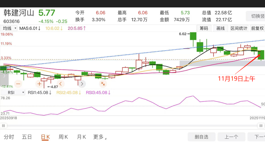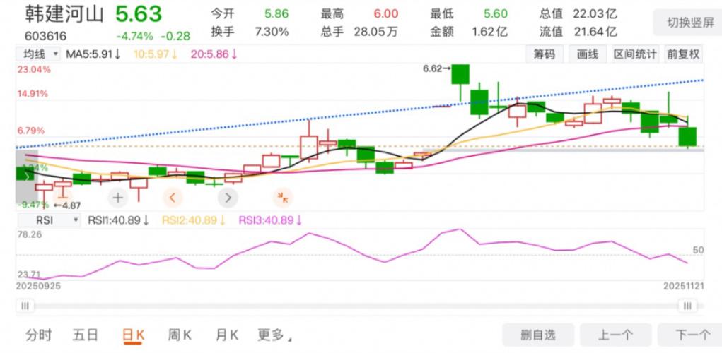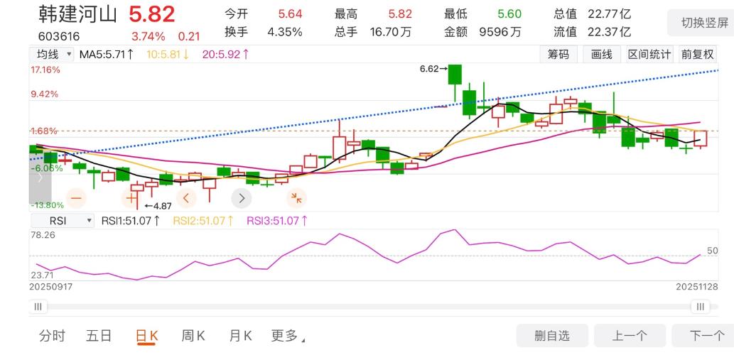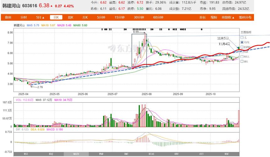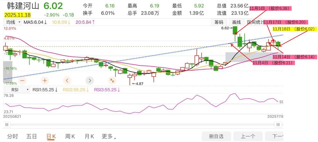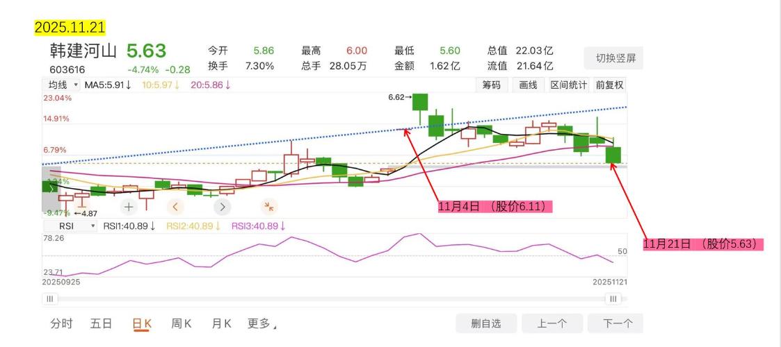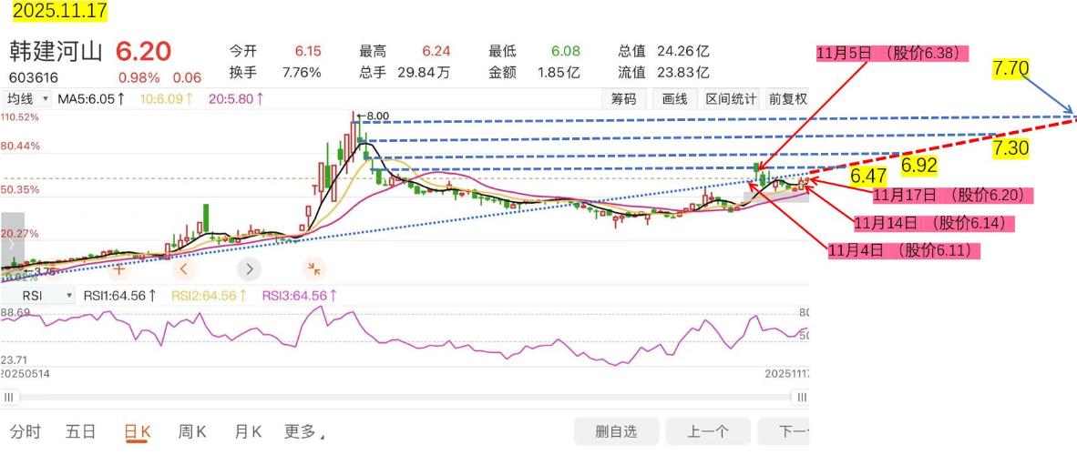 会回到年内之前的新高7.5~8.0否 本年度至11月7日,韩建河山股价的当年累积总涨幅是73.5%(2025年1月2日当日收盘股价3.50)。 现在回看11月4日那天当日股价涨停6.11的点位和之前的年度上升趋势线连接上正好是趋势线上。今年实际上韩建河山在经历之前2年的股价大幅下跌后,从1月2日至4月9日(4月9日当日股价3.09)的盘整,4月9日后借助因政策利好、经营业绩改善预期的利好形成趋势线...