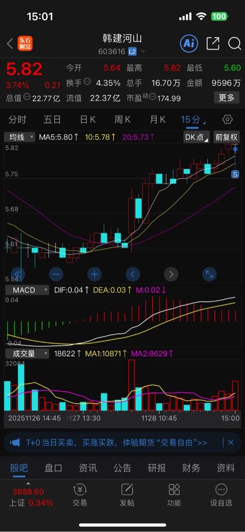 $韩建河山(SH603616)$15分钟的macd,白线将要下穿黄线,我先出来避险,回调再伺机买进