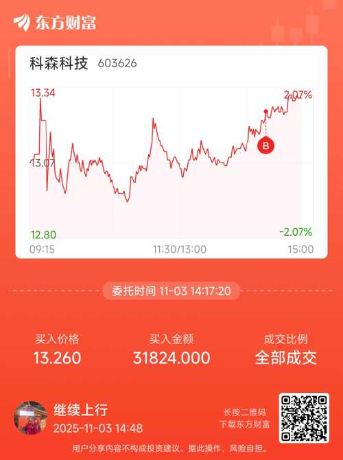 $科森科技(SH603626)$进了,搏一搏,量价比较配合,开多,记录一下 买卖方向:开多 笔记:量价还不错,赛道力度还行,叠加突破二十日均线,进场博弈一下