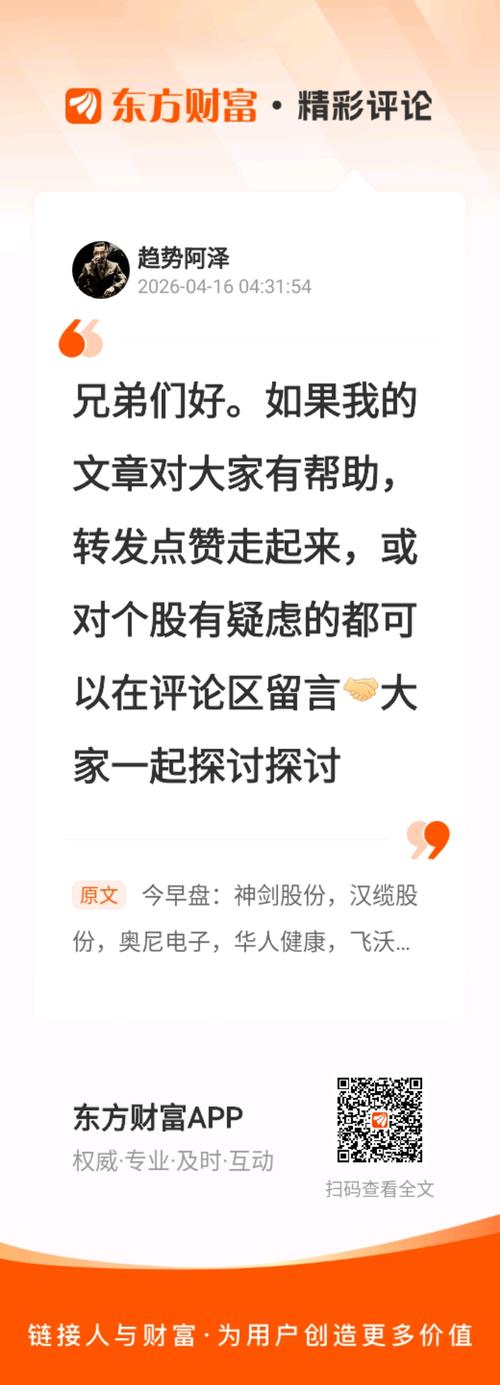 103- 0416 昨日指数高开低走,创业板指开盘涨超1%创10年多新高,随后回落转跌调整。盘面上:热点转到医药,医药股走强,医药商业、药店、减肥药、创新药、中药等方向上涨;算力仍然较强,高低切换。猪肉板块、电网设备板块反弹;银行股午后护盘明显。旅游酒店、宠物经济等大消费概念反弹上涨;商业航天板块、超导、风电、物流、游戏、消费电子等方向个股均有表现。 消息面:两部门:调整银行业金融机构境外贷款业务杠杆率;宁德时代业绩超预期;佰维存储:一季度净利润28.99亿元 环比增长252%;张雪机车:将参加4月17日-19日的荷兰站赛事;鼎泰高科(301377)2026年第一季归属于上市公司股东的净利润为2.61亿元; 纳指高开高走涨近1% 量子科技概念股全线大涨 中概股指数涨超0.5%;美国和伊朗据悉考虑将停火协议延长两周 以争取时间和谈;马斯克官宣 特斯拉股价涨超7%; 机构席位净买入长源东谷(603950),盛视科技(002990),中工国际(002051),协创数据(300857),华人健康(301408),纳百川(301667),宏明电子(301682),新朋股份(002328)等公司。 首板观察:津药药业、瑞康医药、神剑股份、汉缆股份、中嘉博创、大胜达、丽江股份、福蓉科技、居然智家等 今日重点观察:算力及AI科技及业绩预增股等 昨日涨停观察:医药观察:津药药业、哈药股份、瑞康医药、健信超导、海正药业、金陵药业等 算力硬件观察:中嘉博创、利通电子、沃格光电、中工国际、奥尼电子、盛视科技、大胜达等 科技机器人:和胜股份、福蓉科技、春秋电子等 商业航天:博云新材、航天工程、飞亚达、神剑股份等 绿电及电池:圣阳股份、长源东谷、禾望电气、华菱线缆、华源控股等 大消费:天邦食品、丽江股份、新宝股份等 其他观察:汇通能源、交建股份、吉比特、行动教育、梦天家居、申通快递、立达信等 低吸高抛。高手自便,买卖自己决定,风险自控