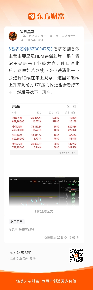 $香农芯创(SZ300475)$香农芯创香浓主营主要是是HBM存储芯片,跟车香浓主要是基于业绩大喜,昨日消化后,这里如若继续小涨小跌消化一下会选择继续在车上观察,这里如继续上升来到前方170压力附近也会考虑下车,然后寻找下一班车。