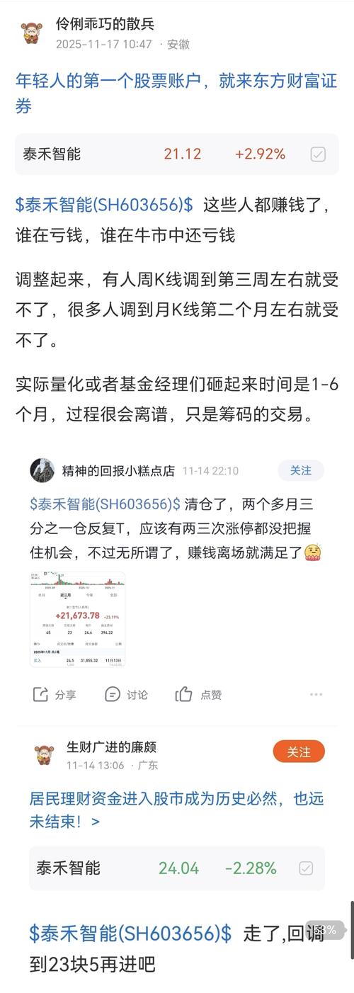 $泰禾智能(SH603656)$ 远离黑暗,拥抱阳光 泰禾这票比较简单,散户钱都是血汗钱, 21元,21.3元都是低位,不要低位割肉,要赚钱才能走。 有人炒股成了臆想症,晚上12点发言乱吐槽。 这边把以前高点低点帖子发出来,有兴趣可以去这边以前帖看。散户好运,多多赚钱改善生活。股东大会过去,没有雷。
