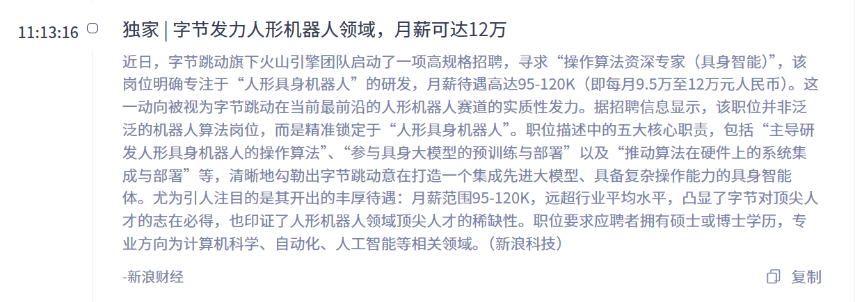 字节高薪招聘机器人算法专家加速布局具身智能 --------- 近日,字节跳动集团启动了面向人形具身机器人操作算法资深专家岗位的招聘,月薪95K-120K,年薪高达百万。招聘页面显示,该岗位将主导人形具身机器人的操作算法研发,涵盖算法架构设计、抓取算法、VLA模型研发、灵巧手等方向。此外,还将参与具身大模型的预训练、后训练、SFT,以及评测与模型部署等工作。 字节跳动在具身智能领域的布局由来已久,...