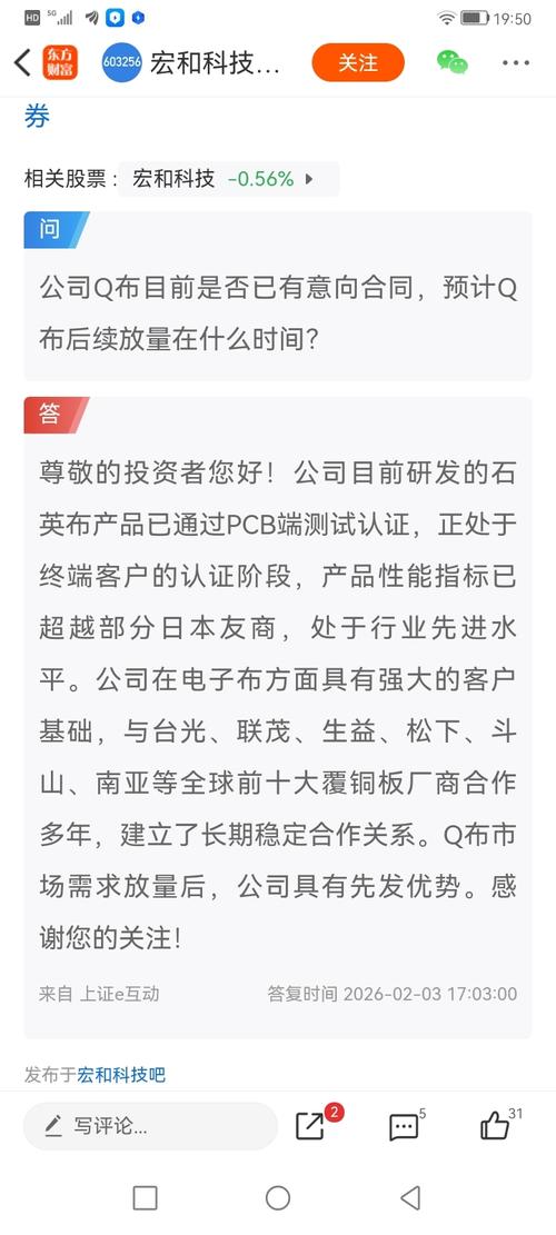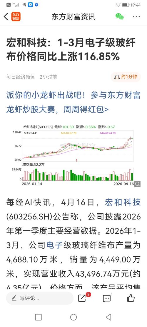 $石英股份(SH603688)$一季报拖到月底才发,看来还是不太行。业绩好的已经早早发了:宏和科技(603256.SH)公告称,公司披露2026年第一季度主要经营数据。2026年1-3月,公司电子级玻璃纤维布产量为4,688.10万米,销量为4,449.00万米,实现营业收入43,496.74万元(约4.35亿元)。价格方面,该产品平均售价由去年同期的4.51元/米上涨至9.78元/米,涨幅达11...