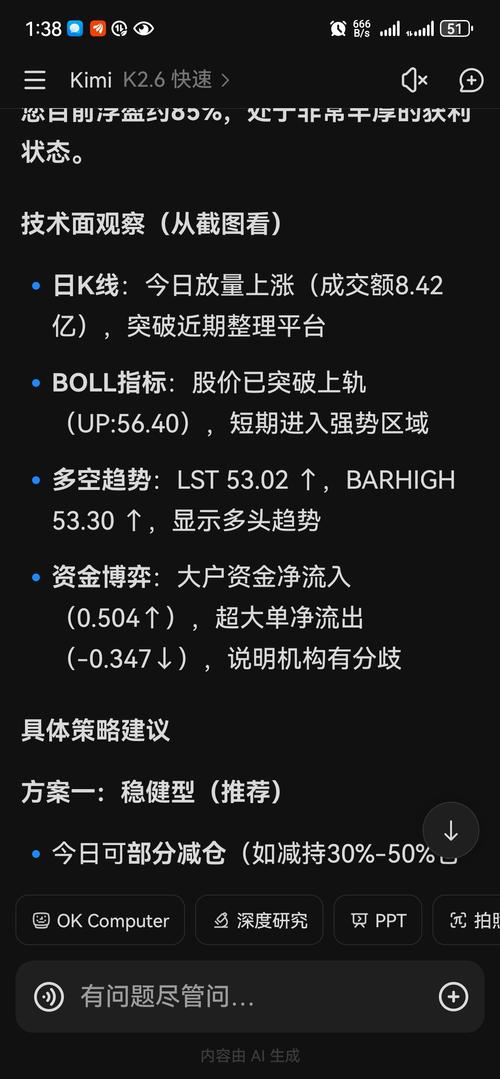 $纽威股份(SH603699)$我问了Ai今天如何操作。Ai说减仓一部分。那我减少部分仓位吧。目前1成胜宏,1成纽威好了,剩下的逆回购。这个月胜宏30%涨幅,纽威也差不多20%了,差强人意了。59跟60也差不多了。突破新高估计又是坎坷旅程~大家发财。