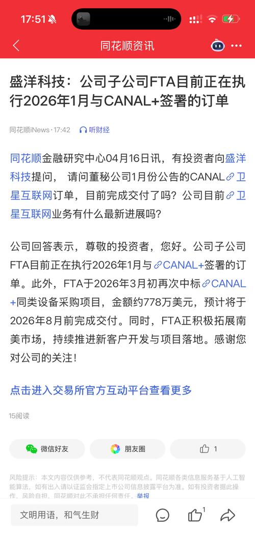 【问】请问董秘公司1月份公告的CANAL卫星互联网订单,目前完成交付了吗?公司目前卫星互联网业务有什么最新进展吗?【答】盛洋科技:尊敬的投资者,您好。公司子公司FTA目前正在执行2026年1月与CANAL+签署的订单。此外,FTA于2026年3月初再次中标CANAL+同类设备采购项目,金额约778万美元,预计将于2026年8月前完成交付。同时,FTA正积极拓展南美市场,持续推进新客户开发与项目落地。感谢您对公司的关注!