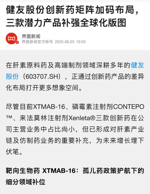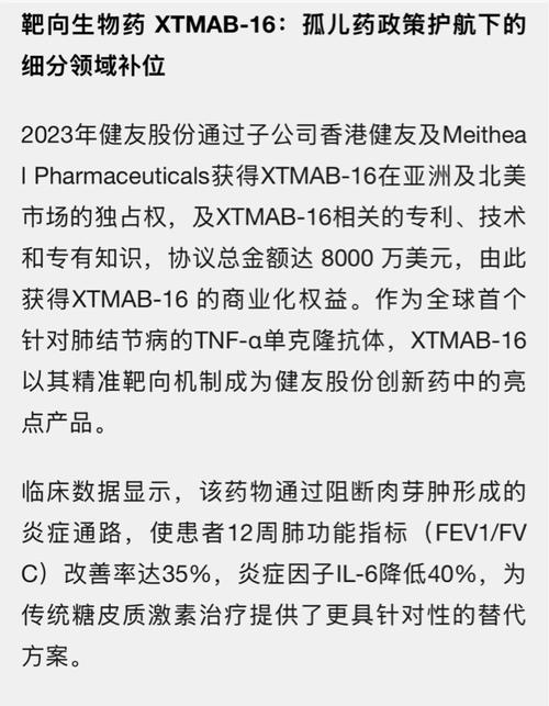 $健友股份(SH603707)$健友股份XTMAB-16于2020年11月就获得了FDA的孤儿药资格,这意味着XTMAB-16可享受7年市场独占期等政策红利,且上市周期预计可缩短30%。2025年3月,XTMAB-16已完成II期患者入组,预计今年年底启动III期临床。孤儿药确定了独创性及唯一性。 XTMAB-16(TNF-单抗) •定位:全球首个针对肺结节病的TNF-单克隆抗体,获FDA孤儿药资...