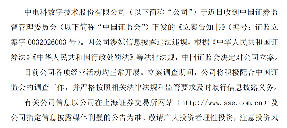 最近A股调整的幅度非常大,而这个时候,竟然还没有来利好,难道是放弃了吗?今天晚上我非常绝望,不仅仅央行开始逆回购收水了,不仅仅是融资余额下降了,而且股票跌到这份上了,晚上竟然还有4个被立案,5个发布退市风险提示,还有18个股票要大幅减持股票,大家一定要注意风险啊。 4月3日晚上被立案的公司名单: 第一家:电科数字 2026年4月3日,公司公告被证监会立案调查,涉嫌信息披露违法违规。直接导火索是:2...