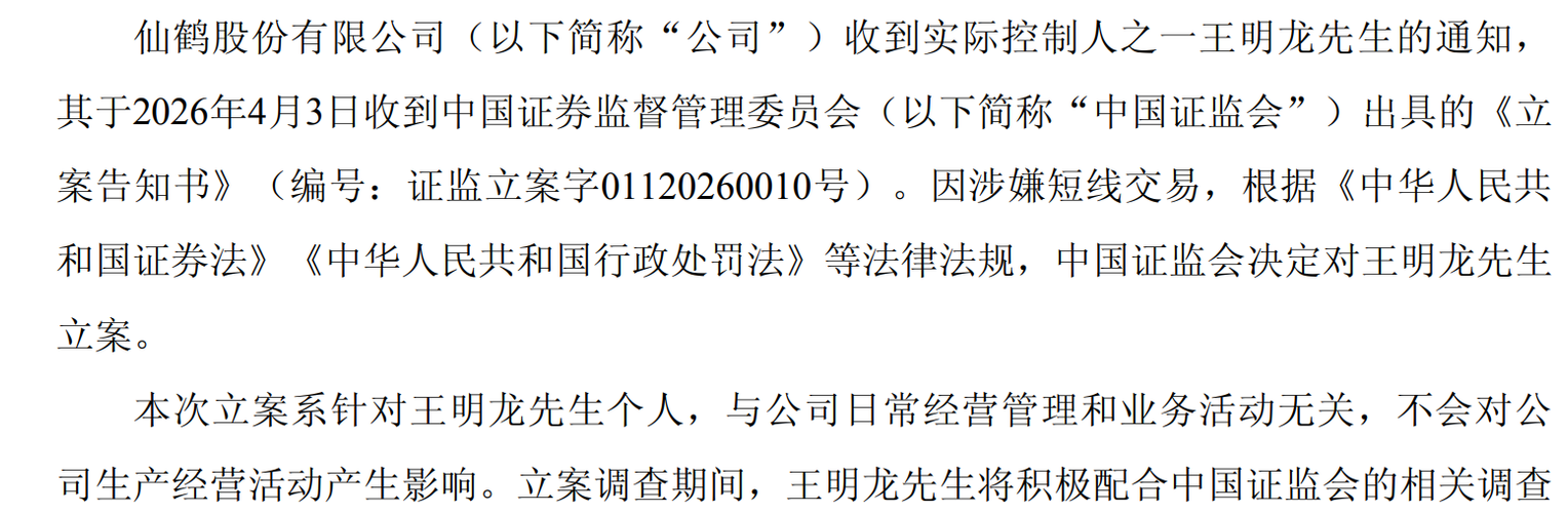 资讯 仙鹤股份实控人之一王明龙涉嫌短线交易被立案