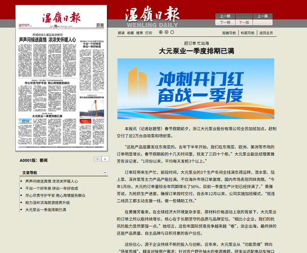 温岭报社过年采访大元泵业的报道,一季度订单排满,增长50%