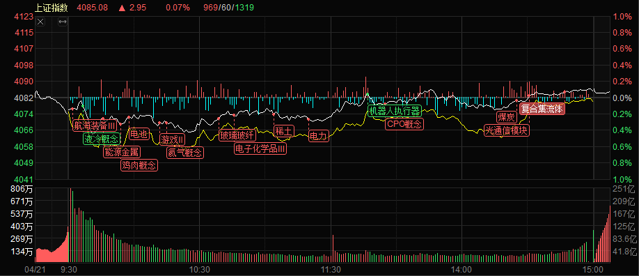 今天的A股三大指数走得跟画了条水平线似的,平平磨了一整天,表面上风平浪静,可盘里的资J却悄悄完成了一轮大切换,极致的分化行情,全藏在这根平线里了。 技术面上也没啥复杂的,沪指昨天刚冲完4080点,今天就在这个位置做横盘震荡,下方60日线有强支撑,上方4100点有明显的压力,姿金不敢贸然上攻,也不愿意砸盘往下走,就卡在中间等信H——等的就是一季报的业绩验证,还有后续症策的催化。 板块梳理 今天的板块...