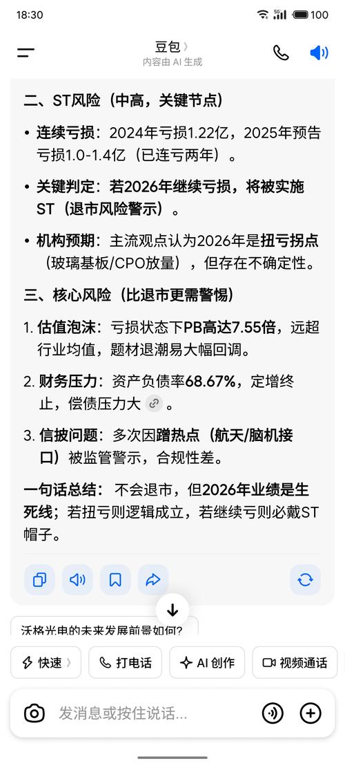 $沃格光电(SH603773)$ 豆包说被st概率很高,已经连亏2年,今年26继续亏就st了