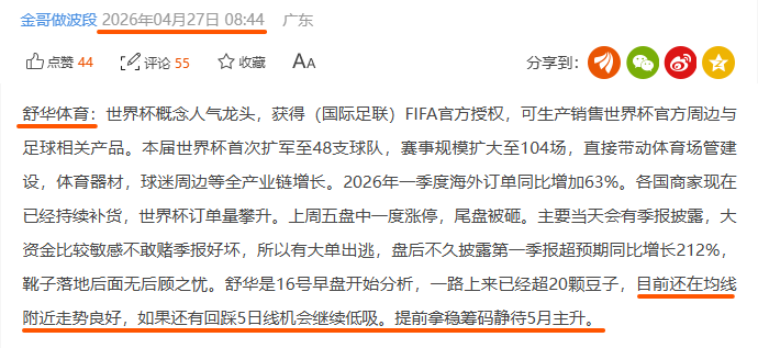 盘面依旧凌乱,每天轮动几个方向,各路资金各自为战,电力双雄成为市场亮点,一直蹲守的世界杯龙头继续稳步上行,这条线是5月比较有确定性的线,相当给力。以下分析都是基于公开信息整理,仅供参考,不构成任何投资建议。 舒华体育:世界杯概念人气龙头,已经获得(国际足联)FIFA官方授权,可生产销售世界杯官方周边与足球相关产品。经过披露第一季报超预期同比增长212%后,舒华是16号早盘开始分析,一路上来已经超3...