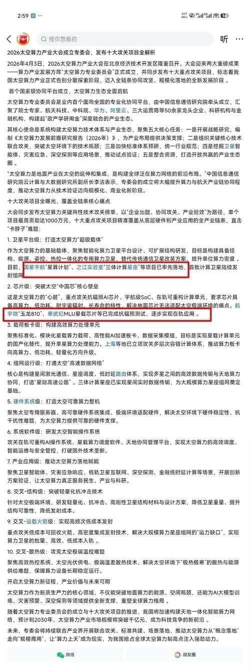 Y国家航天局圆桌会议:前瞻布局太空算力+太空制造,涨停,航宇微300053揭榜挂帅与中科院计算所合作**“一星多卡”星载算力架构**,从芯片供应商升级为太空算力方案商,支撑低轨星座大规模组网。航宇微是A股中太空算力协会中市直最小股价最小的唯一,10倍预期。航宇微(300053)是太空算力专业委员会的核心成员单位 官方与权威信源确认 。成立大会(4月3日):作为星载AI芯片代表,被列入首批核心成员。...