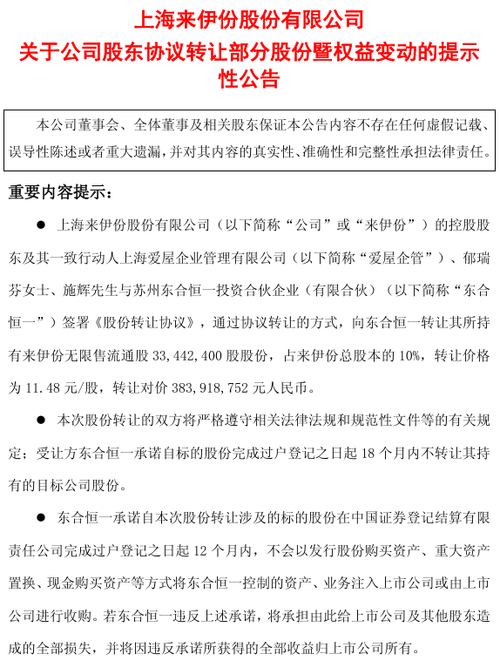 知名产业资本的入局,被市场视为来伊份破局转型、走出业绩泥潭的重要契机 投资时间网、标点财经研究员习羽 一则看似寻常的股份转让公告,为何能让深陷业绩困境的来伊份(603777.SH)股价大变? 4月8日午后,来伊份股价快速上扬,最终封住涨停板。当日晚间公司披露了一则股份转让公告。 公告内容显示,来伊份控股股东及其一致行动人——上海爱屋企业管理有限公司、郁瑞芬、施辉,与苏州东合恒一投资合伙企业(有限合...