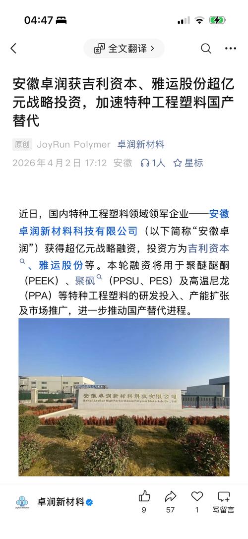 雅运股份:感谢投资者关注!公司与其他机构共同参股投资安徽卓润新材料科技有限公司,公司持股约5.45%,目前已完成工商变更登记。卓润新材料主营特种工程塑料,能够对聚醚醚酮(PEEK)等特种高分子材料实现自主研发与国产替代,以及为相关行业轻量化、小型化、高性能化和耐久性要求提供解决方案。卓润新材料已取得年产800吨聚醚醚酮及2000吨聚砜树脂的规划审批,一期已建成年产400吨聚醚醚酮树脂产线,项目二期在建中。卓润新材料此轮融资将用于聚醚醚酮(PEEK)等特种工程塑料的研发投入、产能扩张及市场推广。公司对卓润新材料的投资不影响公司的日常生产经营,不会对公司财务情况造成重大影响,已履行了必要的审批手续。谢谢!