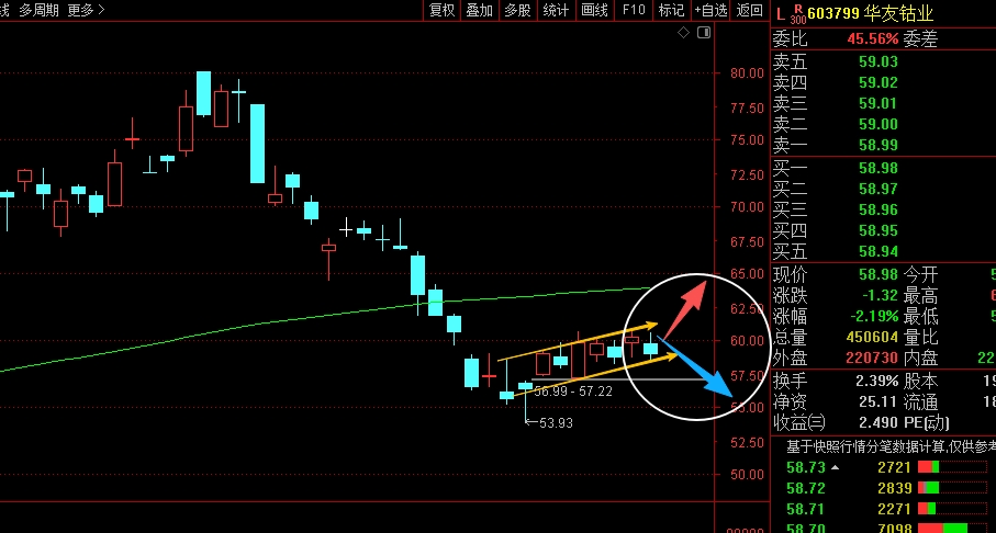 $华友钴业(SH603799)$前期大幅回落后,近期跟随大盘反抽起来,整体来看幅度不大,短线这几天主要是走出了一个小的斜率不大的上升通道,但量能不大,所以看起来不强势,接下来重点就看盘面是否能沿着通道继续震荡反抽,如果能继续起来,重点就看头上绿色大均线53.98位置的压力,不带量突破站稳,就要注意被压制回落了;反过来,如果通道被跌破就要注意盘面再次的回落风险了,严格控制仓位应对,防着再次破位后潜在...