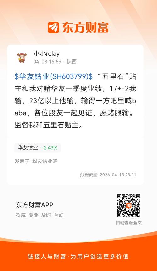 $华友钴业(SH603799)$“五里石”贴主和我对赌华友一季度业绩,17+-2我输,23亿以上他输,输得一方吧里喊baba,各位股友一起见证,愿赌服输。监督我和五里石贴主。