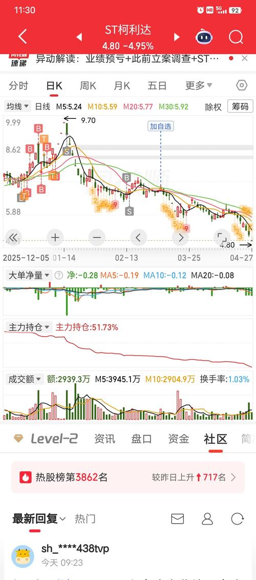 $ST柯利达(SH603828)$虽然我9.22跑了,但是我还是想说,这个庄家不是东西,难道是坐庄失败割肉出局吗?9.7没跑的人得翻倍才能回本了,太狠了!还有3.2就一起玩耍的老股友吗?跌不动了我就回来买,我个人觉得要么是年报有雷,要么就是加速筑底了,最差就是坐庄失败,庄家跑路。