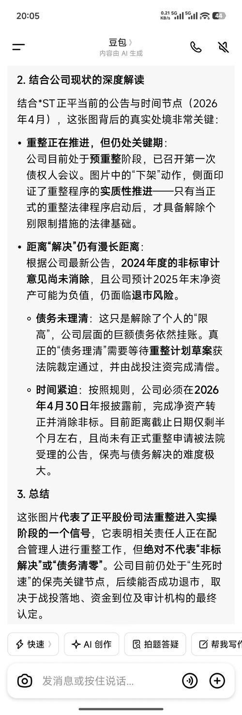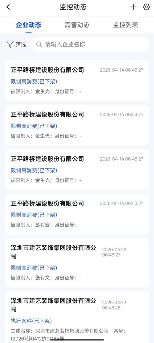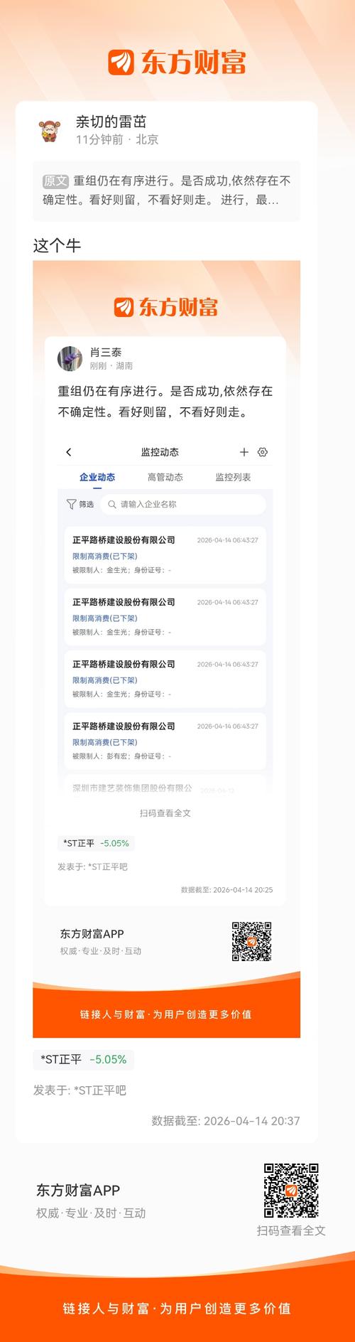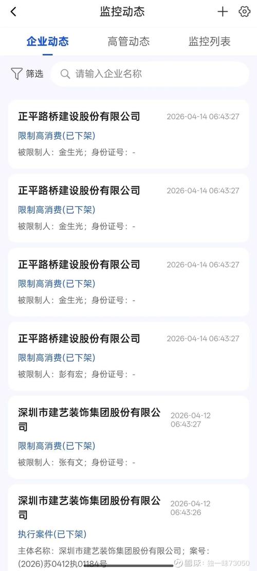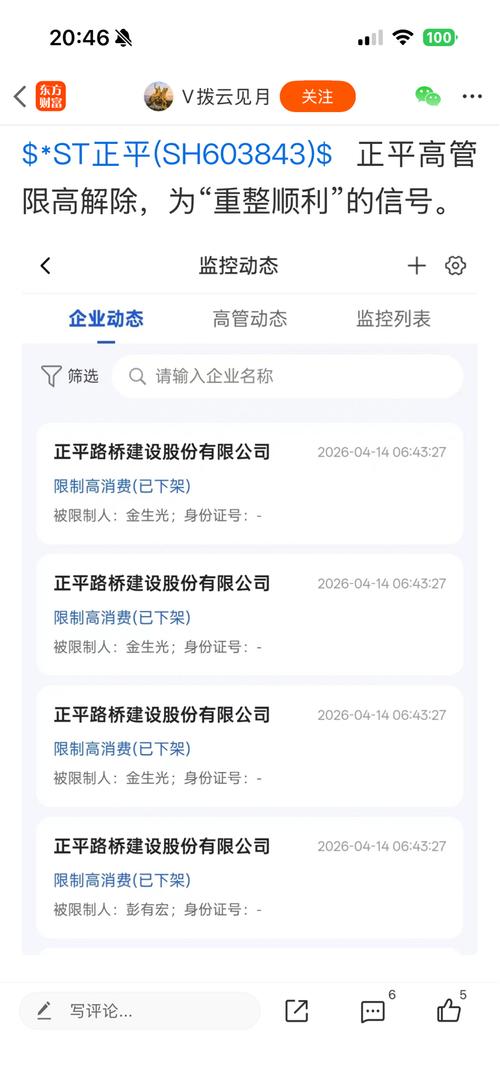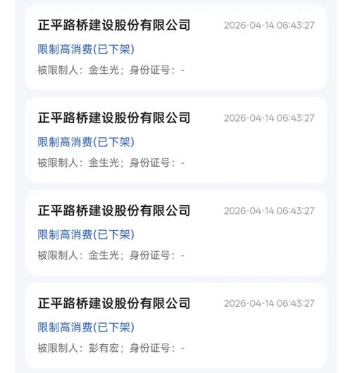 重磅铁证!限高集体下架实锤,法院已受理重整,正平保壳决战全面提速! 核心结论 2026年4月14日,企业动态监控数据显示,正平路桥建设股份有限公司实控人金生光、核心高管彭有宏的多条限制高消费记录被同步集体下架。结合当前正平处于4月年报保壳生死关的关键节点,这一信号绝非偶然,而是法院已正式裁定受理重整申请的最强铁证! 一、法律铁律:限高下架=法院受理重整的法定必然 根据《企业破产法》及最高人民法院相...