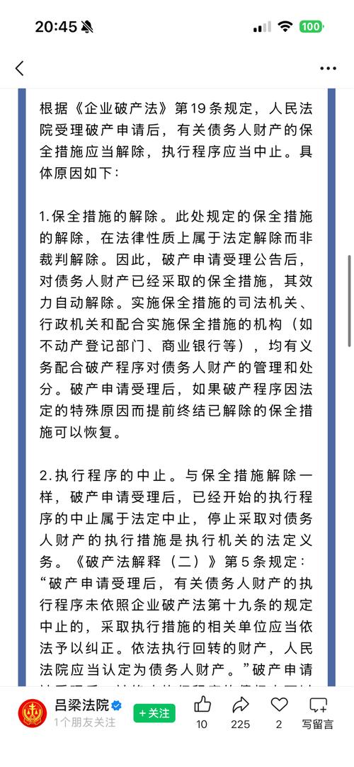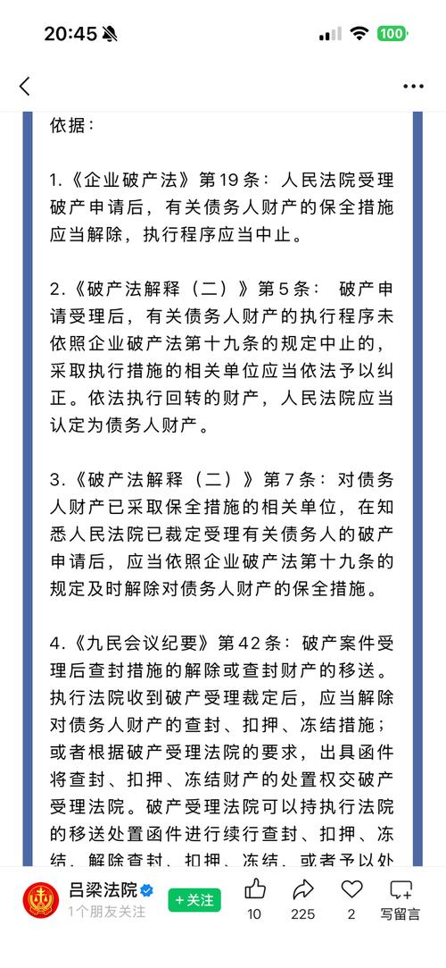 $*ST正平(SH603843)$只能说股吧里还有不少能人善于挖掘信息的。这个解除限高的截图确实显示法院在统一解除了对法人个人的执行措施,但是否解除了对正平公司的查封措施还不好判断。 但必须要说的是,人民法院在受理破产重整案件后,确实是要依法解除对破产企业的各项执行查封措施的。因为我本人就是律师,接触过破产案件流程。相关法律规定,我也截图出来了。大家自己判断吧。哈哈哈