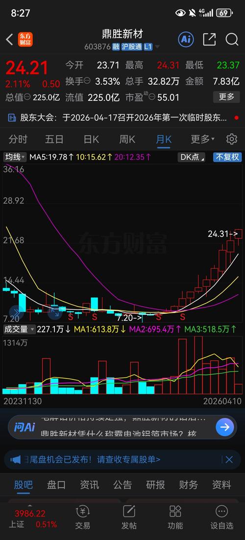 $鼎胜新材(SH603876)$这月线,如果从去年4月7日最低价算起,10倍就是70多,正好突破新高