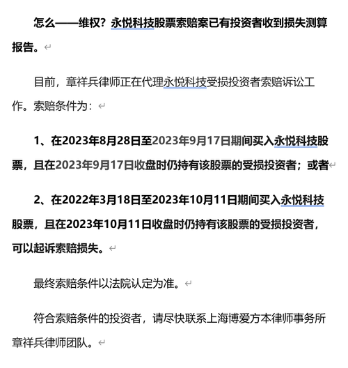 $永悦科技(SH603879)$永悦科技(603879)股民索赔征集,索赔条件: 1、2023年8月28日至2023年9月17日之间买入603879永悦科技,且在2023年9月18日(含当日)之后卖出或继续持有者 2、2022年3月18日至2023年10月11日之间买入603879永悦科技,且在2023年10月12日(含当日)之后卖出或继续持有者。 股民索赔时效截止日期:2026/09/17。符合...