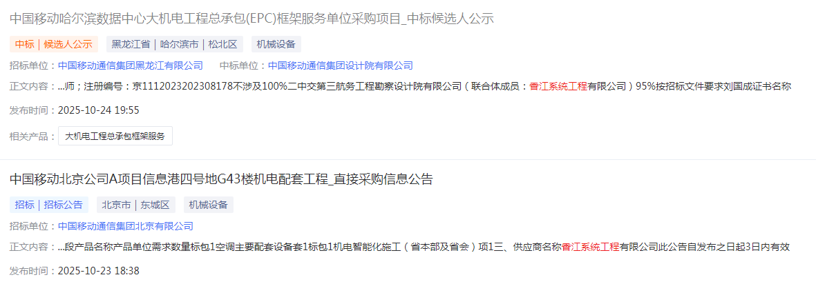 有人说香江被限制竞标?香江刚刚与中移动设计院公司组成联合体,中标了中移动哈尔滨项目。 而且香江也刚刚中标了中移动北京信息港机电设备采购项目,并且该项目属于排他性直接采购,系甲方指定采购香江的特定产品,直接排除了其他竞争对手,显示出香江某些数据中心机电产品已具备相当的市场竞争力和独占性。 哈尔滨项目中标金额不到1.6亿,中移动设计院占其中300多万设计费,其余都由香江供货。虽然金额上达不到公告标准,...