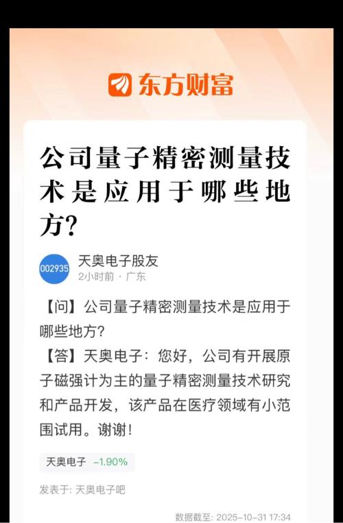 $城地香江(SH603887)$香香业绩不好,概念也炒作好久了。大家要不要来天奥电子?周五天奥电子董秘明确答复了公司的量子测量已经实现了试用。天奥电子的量子科技概念早在2020年就开始研发了。它家的量子科技不是PPT画饼