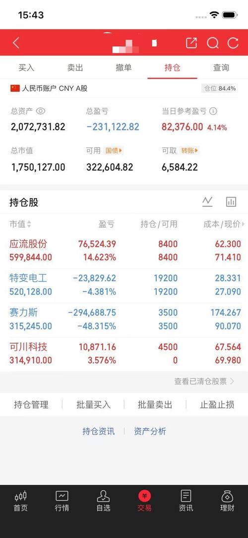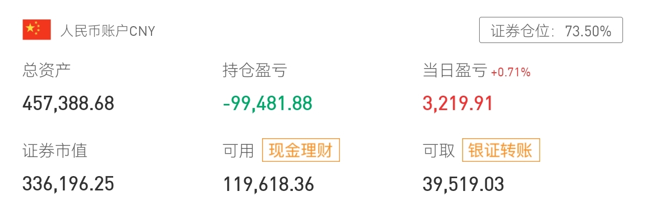 0410收市 人民币账户持仓稳健,证券仓位超七成,总资产小幅增长,当日盈利可观,现金理财灵活配置。