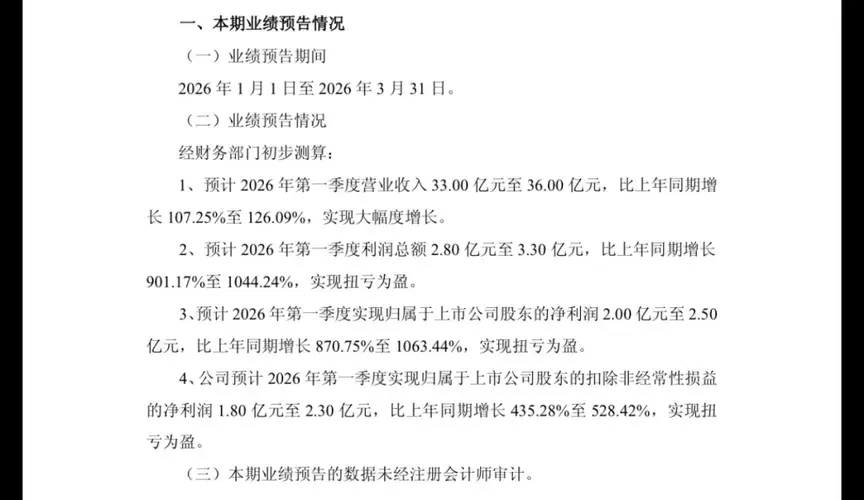 $龙蟠科技(SH603906)$ 作为国内磷酸铁锂正极材料领域的领军企业,龙蟠科技在经历了2023-2024年的行业低谷后,于2026年一季度迎来了标志性的业绩拐点。 根据公司2026年4月15日发布的业绩预告,预计2026年第一季度实现营业收入33亿元至36亿元,同比增长107.25%至126.09%;实现归属于上市公司股东的净利润2亿元至2.5亿元,同比扭亏为盈。这一业绩表现不仅远超市场预期,...