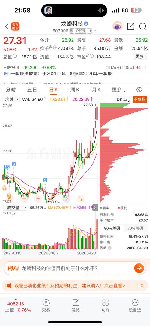 大家晚上好,今天是2026年4月20日,星期一。花姐手中各标简单跟大家阐述一下。 300593新雷能上涨趋势有所减缓,目前依旧沿5日线稳步攀升,继续坚守。603900龙蟠科技今天表现不错,趋势积极向上,全天震荡走高,继续格局持有。上周五新进的两只标的:300184力源信息,早盘高开震荡,果断出局落袋;002961瑞达期货,量价齐跌,早盘高开溢价后快速兑现,不留恋、不格局。 今日新关注两档个股:第一...
