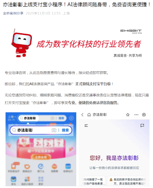 金桥AI法律咨询产品“亦法彰彰”正式登陆支付宝平台! 左手阿里云合法院,以上海高院AI项目为蓝本向全国百亿法院AI市场拓展,并在此平台技术基础上拓展针对律师的aiagent、用户的法律公共服务;右手与蚂蚁金服合作催收平台,进军千亿催收佣金市场,大模型能力提升下可通过aiagent直接催收赚钱,是A股第一个可以通过aigent打工给股东挣钱的公司。 静待Ai应用风来,金桥必是Ai应用第一龙头!...