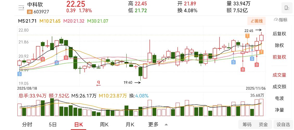 $中科软(SH603927)$站稳22.21,下一个平台是24,均线多头排列的真好呀