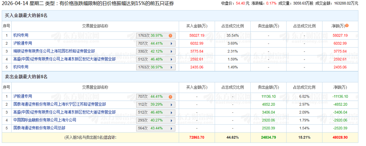 资讯 5.2亿资金抢筹沪电股份,机构狂买长源东谷丨龙虎榜