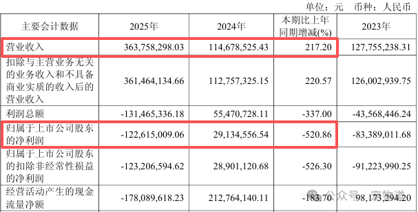 一边是,新增宠物业务创收1.34亿元;一边是,公司净利润从盈利2900万元,到亏损1.23亿元。 4月13日晚间,大千生态发布2025年年度报告,向市场展示了一场颇为瞩目的战略转型。财报披露,公司全年实现营业收入3.64亿元,同比大幅增长217.20%。然而,在营收高歌猛进的另一面,归属于上市公司股东的净利润却亏损1.23亿元,与上年同期的盈利2913.46万元形成鲜明对比。 资料来源:大千生态公...