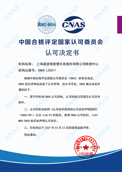 喜讯 |上海威派格智慧水务股份有限公司检测中心正式获颁CNAS国家实验室认可