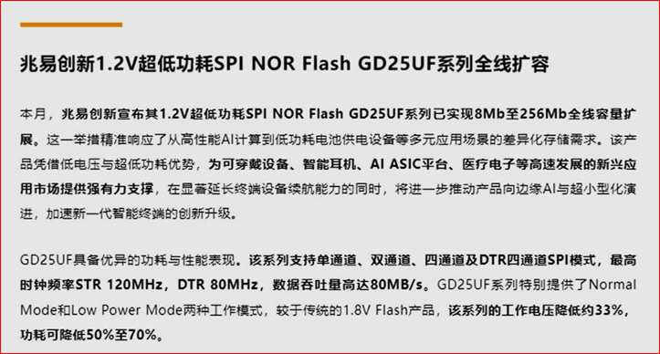 兆易创新芯片容量扩展8Mb至256Mb。。。。。。。。。。。。。。。。。兆易创新宣布其1.2V超低功耗SPINORFlashGD25UF系列已实现8Mb至256Mb全线容量扩展。这一举措精准响应了从高性能AI计算到低功耗电池供电设备等多元应用场景的差异化存储需求。该产品凭借低电压与超低功耗优势,为可穿戴设备、智能耳机、AIASIC平台、医疗电子等高速发展的新兴应用市场提供强有力支撑,在显著延长终端...