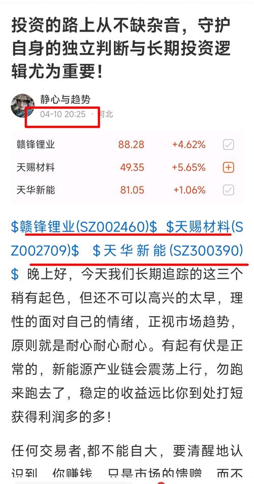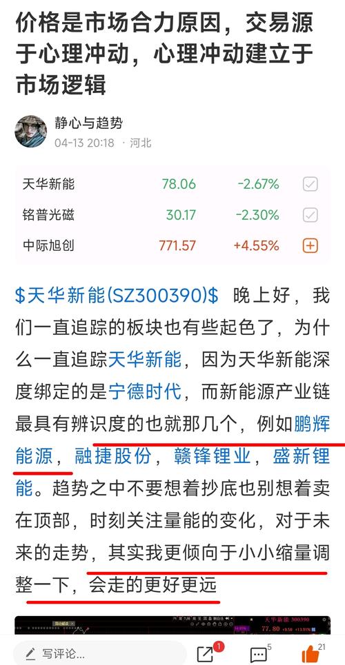 $赣锋锂业(SZ002460)$晚上好,我们追踪的板块今天持续强势,昨天的文章也很明确的表明了,天华新能需要调整才会更远。首先你要明白没有一直涨得股票,也不可能买到一直涨得股票,都是随着趋势慢慢来的,趋势中有震荡有回调有急跌有猛拉,但是你要去观察趋势耐心于等待,只要五日线没事,趋势依然在,今天天华新能休息了,$鹏辉能源(SZ300438)$强势了,那么这个锂电方向依然值得期待的,勿频繁换来换去! ...