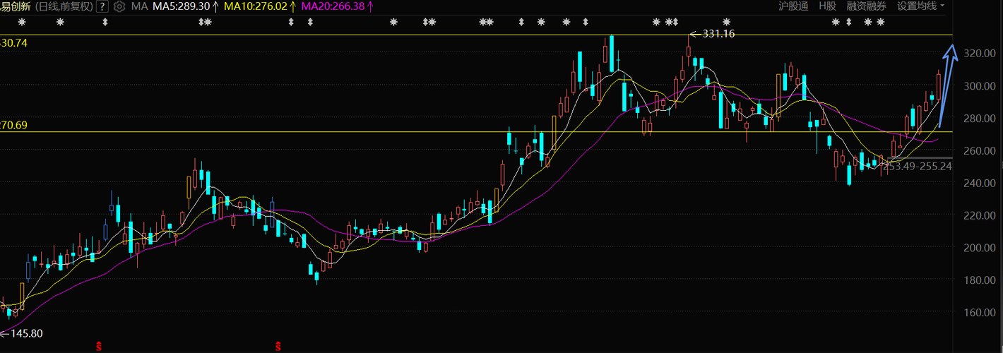 兆易创新:这个老赵讲过的,这几天只看量能就行了,上面其实是有筹码密集区的,想要突破需要放量,才能消化掉之前的筹马,就比如东山,这波突破之后量能是3月的两倍左右,这个量能才能支撑东山持续走二波,如果兆易不放量就是量价背离,所以这几天关键就看量能,早盘兆易有一波很强的拉升,量能其实是有所放大的,既然放量了还动他干嘛?且兆易始终没有破五日均线,所以这里老赵就还是在观望,收盘走出大阳线,反包前两天的震荡区...