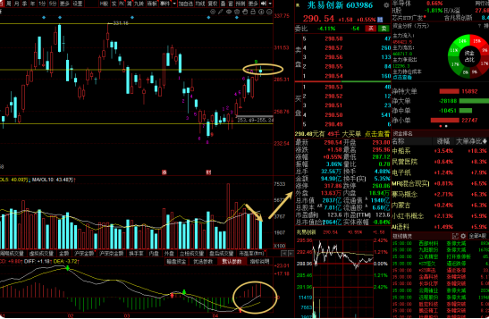 兆易创新:说实话,兆易创新已经量价背离了,周五冲高后留下了上影线,抛压就开始有点大了,今天继续高开回落,走出小阴线,目前的抛压力量还是比多方强一点,而且量能上,今天持续缩量,只有8号的一半了,股价持续上升而量能逐步下降,就是典型的量价背离走势,后续有回调的可能,而且本来兆易继续往上就遇到很强的阻力位,这里是前面几个月横盘震荡的区间,这里震荡的时间越长,留下的筹码就越多,阻力就比较大,所以回踩也是合...