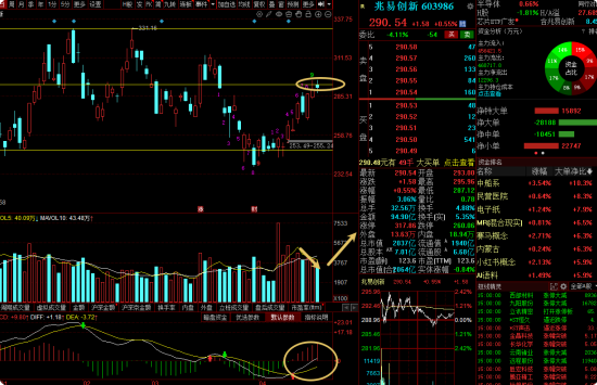 兆易创新:如果你看不懂兆易创新的量价背离,就容易被表面的走势迷惑,昨天早上先冲高后回落,虽然回落的幅度不像东山那么大,但是也留下了小阴线,结合量能来看,股价最近是逐步推升,但是量能却越来越少,形成了典型的量价背离形态,这种是反转信号为主,且上方有很大的筹码密集区,这种情况下不放量怎么突破呢?所以这里老赵有点担心的,兆易有可能回踩以下,但是目前来看,均线还是多头排列,趋势还有惯性,所以可以多观望一下...