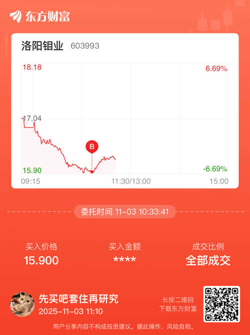 $洛阳钼业(SH603993)$上次13卖掉了,今天16.4先买点回来。做反了