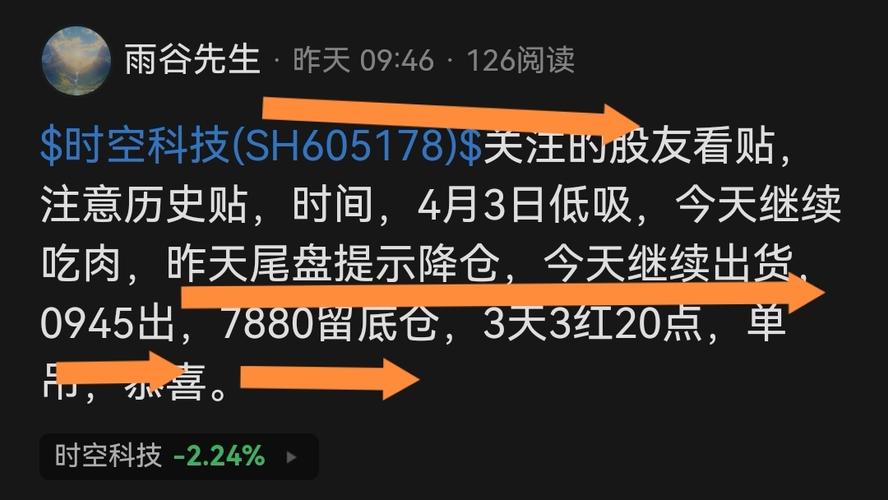 $时空科技(SH605178)$关注的股友看贴,注意历史贴,时间,4月3日低吸,今天继续吃肉,昨天尾盘提示降仓,今天继续出货,0945出,7880留底仓,3天3红20点,单吊,恭喜。